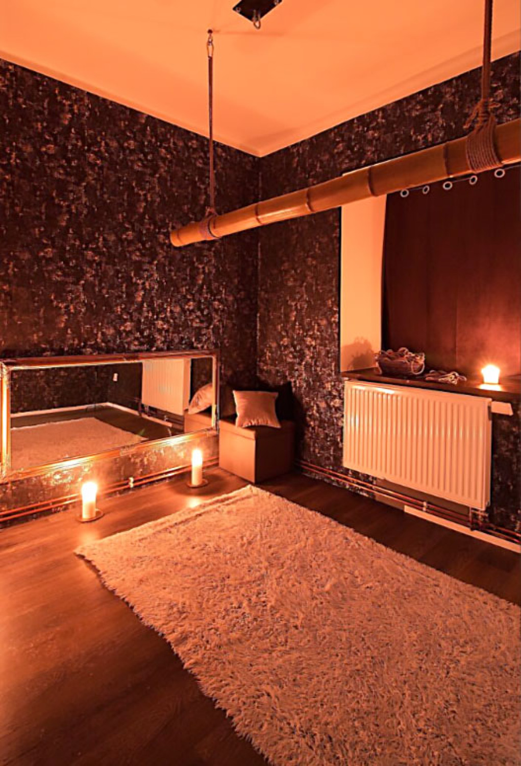 Tento pokoj doporučujeme pro páry, které chtějí prohloubit svou intimitu skrze dotek, dech, pohled a lana, ať už s vlastním vybavením, nebo s lehkým vedením. Ideální také pro samostatné rituály se sebou samým.