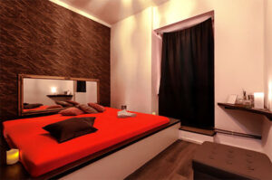 Možnost nastavení intenzity světla podle nálady, svíčky a jemná aromata. Zrcadla podél postelí pro vnímání prostoru, pohybu i detailů.
